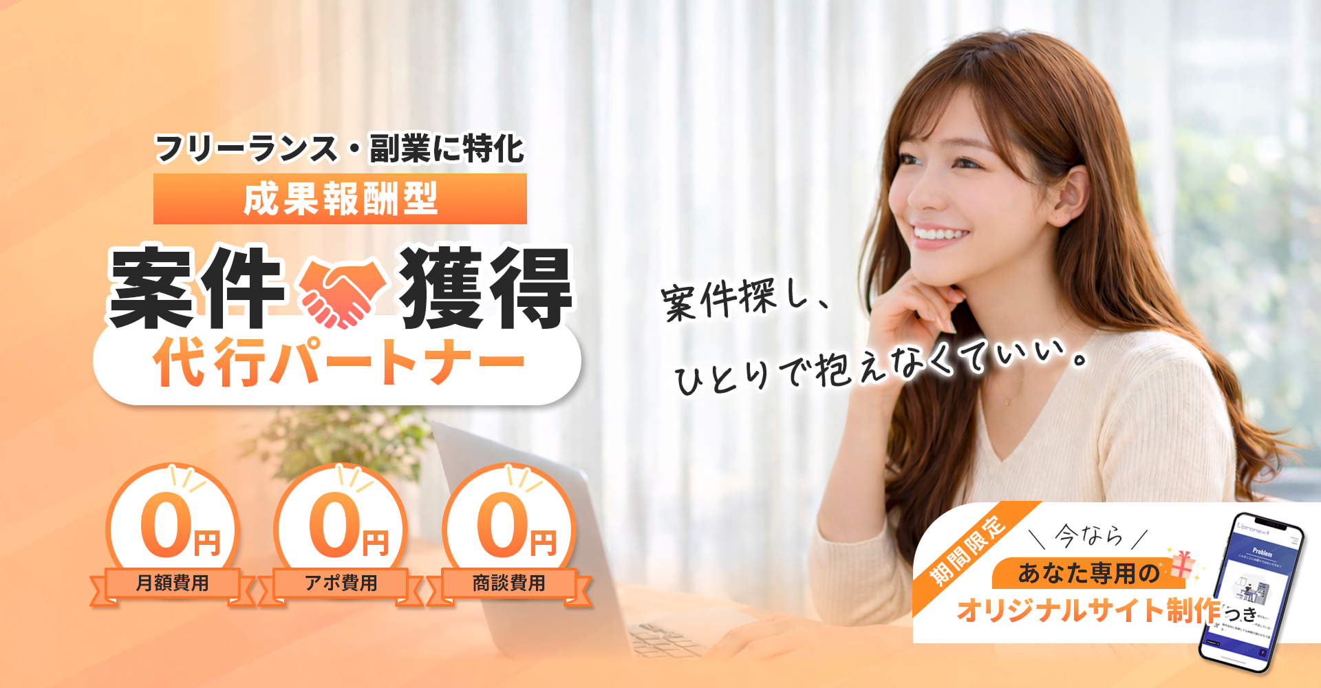 もちろん大丈夫です。フリーランスや副業を始められて間もない場合、実績が少ないことはよくあります。公開可能な実績やアピールできる自主制作を増やすことで案件獲得の確率や単価が上昇します。自主制作のアドバイスやポートフォリオに対するフィードバックなど、セールスマイスターが徹底サポートいたします。